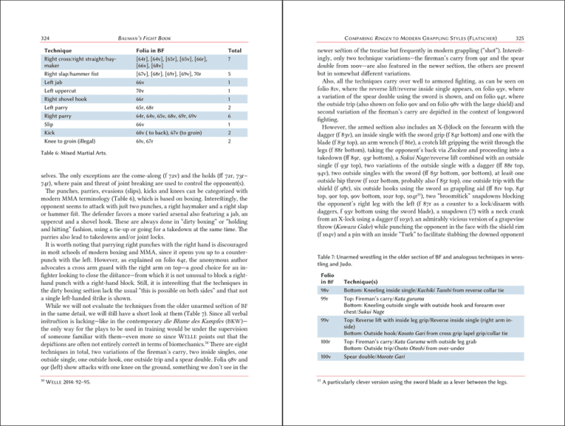 Finley and Tobler also introduce the contents of parts A and B in a paper that discusses the various teachings and explores relationships with the tradition of Johannes Liechtenauer. Bart Walczak discusses the dagger section and uses it as a lens through which to examine the origins and structure of the Augsburg tradition as a whole. Lucien Lee discusses the fencing with the German “Messer” and proposes connections to other pre-Lecküchner texts. Elias Flatscher evaluates the wrestling teachings and compares them to modern wrestling traditions. Charles Lin and Marlene Hurst present a discussion of the historical context of the fighting teachings and some advice on training them in ways that reflect that context. Finally, Dierk Hagedorn shows connections between Part C and Gladiatoria. An appendix contains an edition of another manuscript with similar illustrations by Reinier van Noort and Oskar ter Mors.